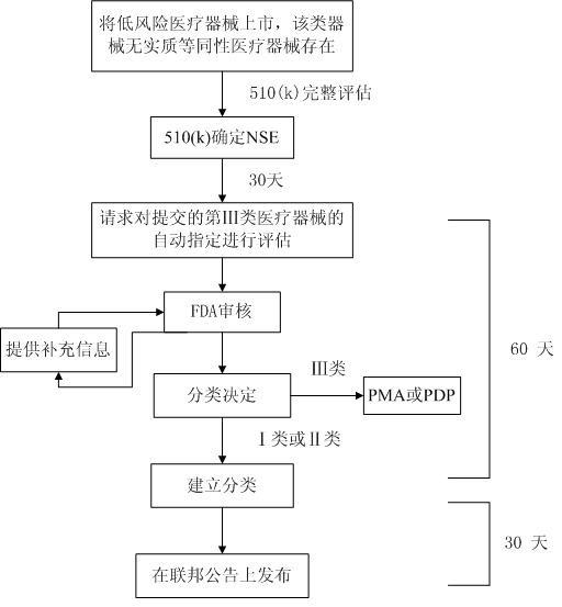 第Ⅲ類(lèi)醫(yī)療器械的自動(dòng)指定,也被稱(chēng)為“de novo”或“基于風(fēng)險(xiǎn)”分類(lèi),是指某類(lèi)新的低風(fēng)險(xiǎn)類(lèi)醫(yī)療器械因?yàn)闆](méi)有與已經(jīng)上市的醫(yī)療器械具有實(shí)質(zhì)等同性而被劃歸為第Ⅲ類(lèi)醫(yī)療器械,依據(jù)de novo機(jī)制將其重新劃歸為Ⅰ類(lèi)或Ⅱ類(lèi)器械的機(jī)制。在該機(jī)制下,當(dāng)?shù)惋L(fēng)險(xiǎn)新醫(yī)療器械申報(bào)者收到非實(shí)質(zhì)等同性(NSE)決議的30天內(nèi),可以向FDA請(qǐng)求對(duì)申報(bào)的器械進(jìn)行de novo分類(lèi)。申報(bào)者須提供器械及詳細(xì)信息的描述,并說(shuō)明要求重新分類(lèi)的理由。FDA會(huì)按照《聯(lián)邦食品、藥品和化妝品法》(FD&C Act)的513(a)(1)制定的要求和標(biāo)準(zhǔn)對(duì)器械進(jìn)行重新分類(lèi)。在申報(bào)者提交請(qǐng)求的60天內(nèi),F(xiàn)DA將會(huì)做出重新分類(lèi)的決定,將申報(bào)的器械劃歸三種器械類(lèi)型中的一種。第Ⅲ類(lèi)醫(yī)療器械的自動(dòng)指定評(píng)估的流程如圖1所示: